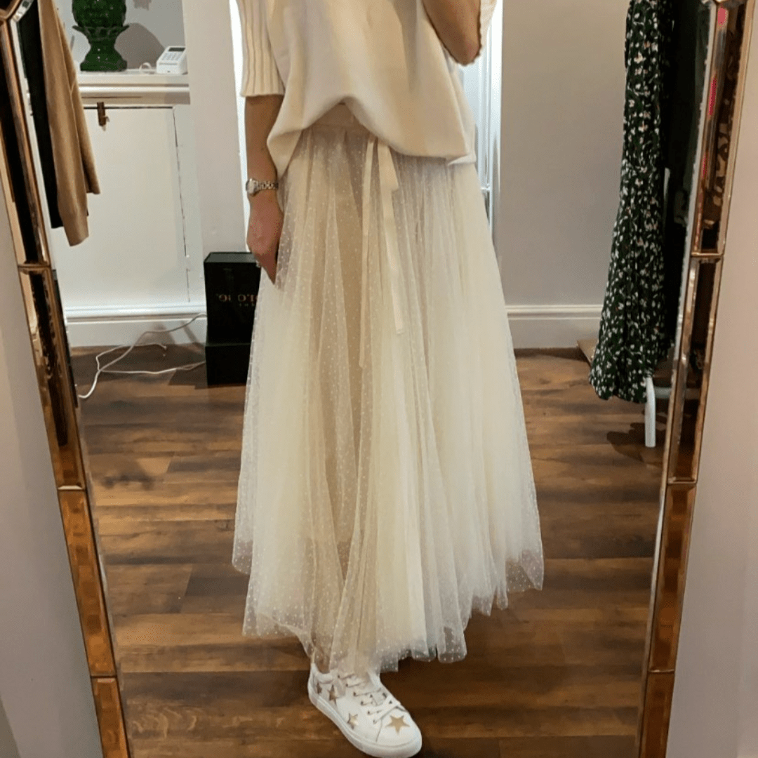 For a cosy vibe, style your trainers with wide leg jeans and a chunky cream knit cardigan. Add soft beige socks that peek just above your sneakers or try a bolder colour and pattern for interest and fun.