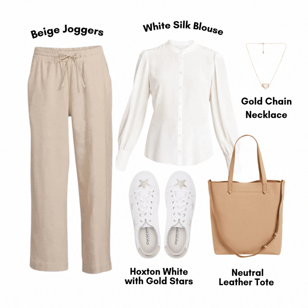 For an elegant, easy-going look, pair your Hoxtons with beige joggers and a white top; either a silk blouse or t-shirt, depending on the occasion. A gold chain necklace and neutral leather tote add warmth while keeping your outfit refined.