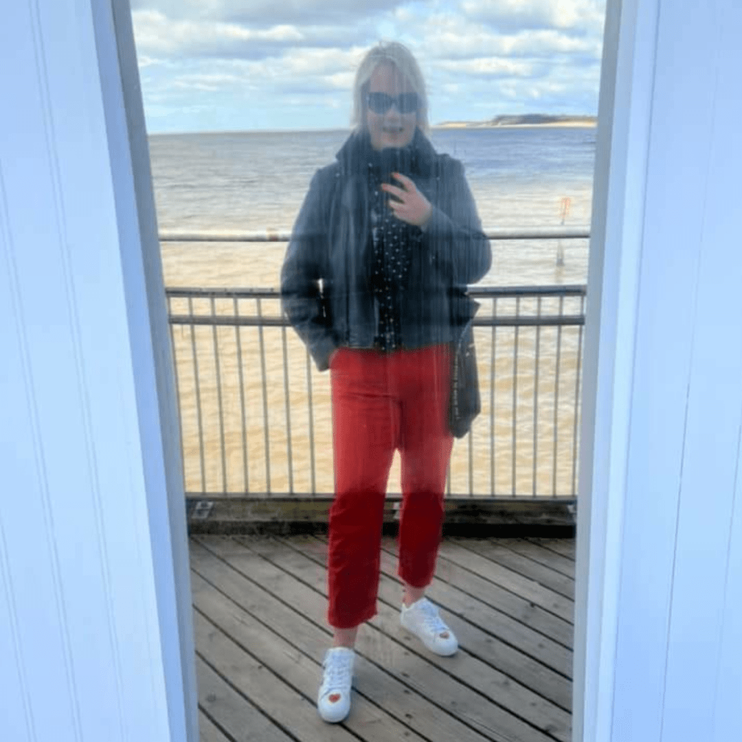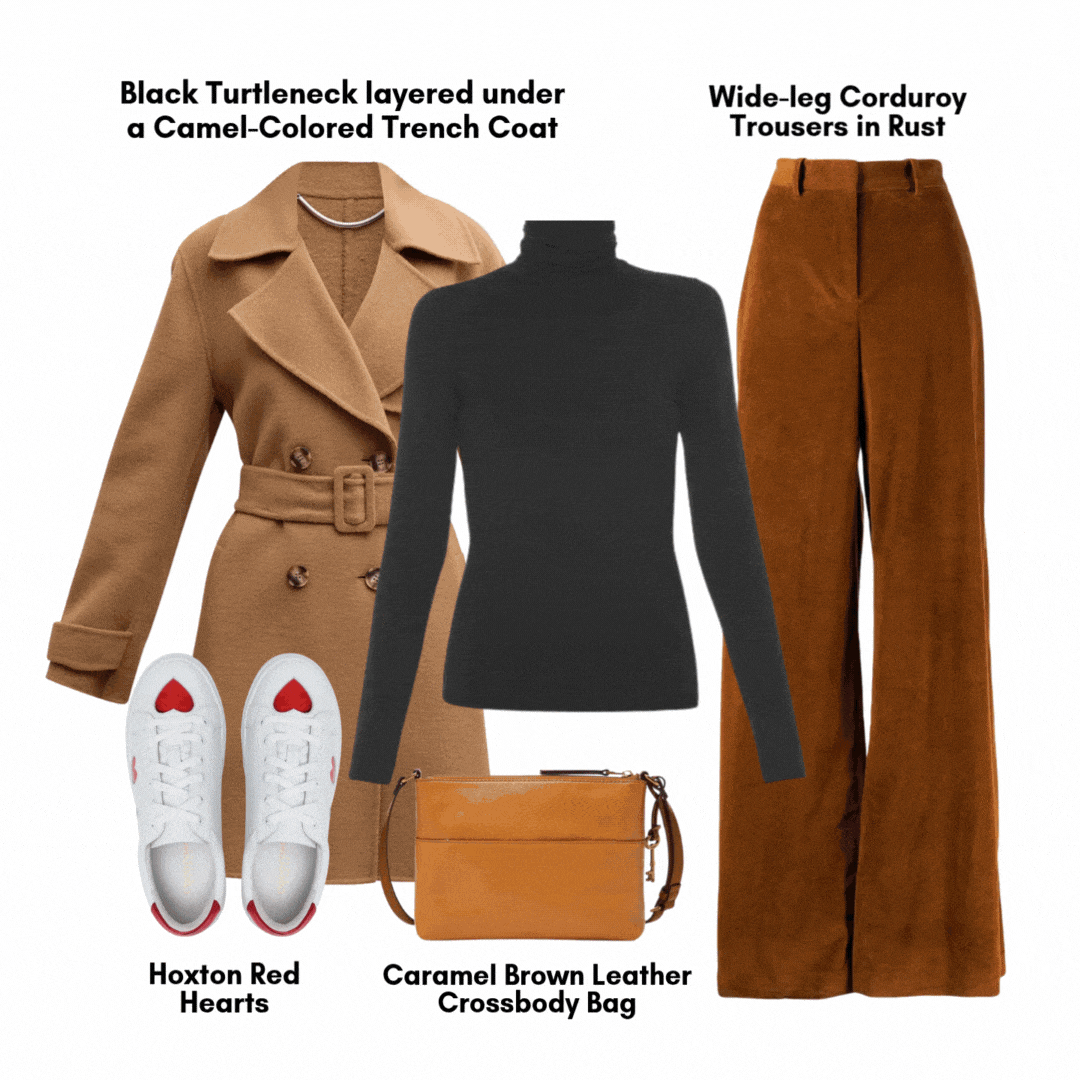 Timeless neutrals get a modern twist in this warm, autumn-inspired palette. A black turtleneck anchors the camel trench, while rust corduroy trousers add rich texture and a retro edge. The caramel crossbody ties it all together, and the Hoxton Red Hearts trainers add a playful pop that feels effortless, confident, and a touch cheeky.