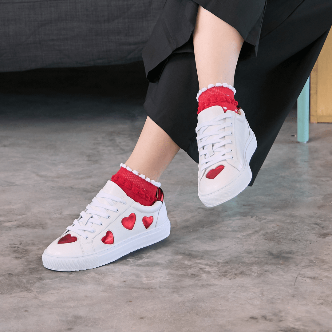 Metallic red hearts create a bold contrast on fresh white leather for a playful, eye-catching look. They are designed to turn heads wherever you go.
